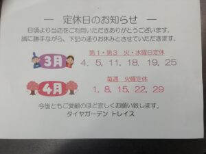トレイス 関連投稿3月.4月 定休日のお知らせです📢2025年3月4日店内レイアウト その32025年3月15日店内模様替え2024年2月11日 前の投稿アドバンプレミアムタイヤ‼️キャッシュバックキァンペーン📢/ 3月1日〜5月6日次の投稿アドバンプレミアムタイヤ‼️キャッシュバックキァンペーン/最大20.000円